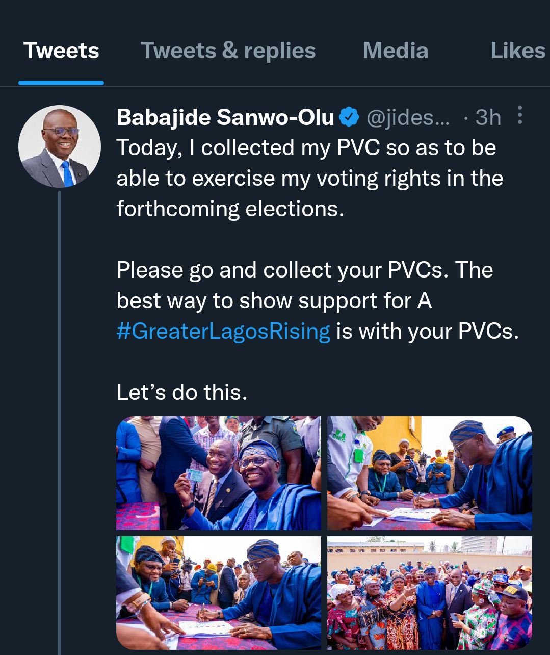 “Today, I collected my PVC so as to be able to exercise my voting rights in the forthcoming elections. Please go and collect your PVCs. The best way to show support for A #GreaterLagosRising is with your PVCs. Let’s do this.