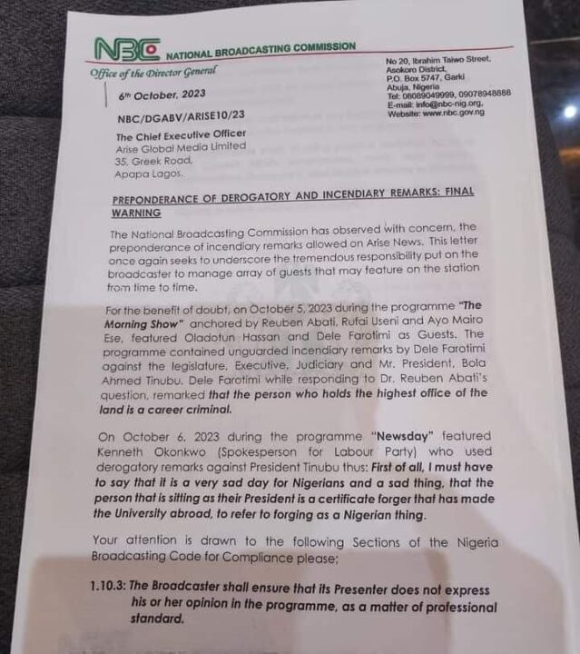The letter titled: “Preponderance of derogatory and incendiary remarks: final warning” reads in part: “The NBC has observed with concern preponderance of incendiary remarks allowed on Arise news.