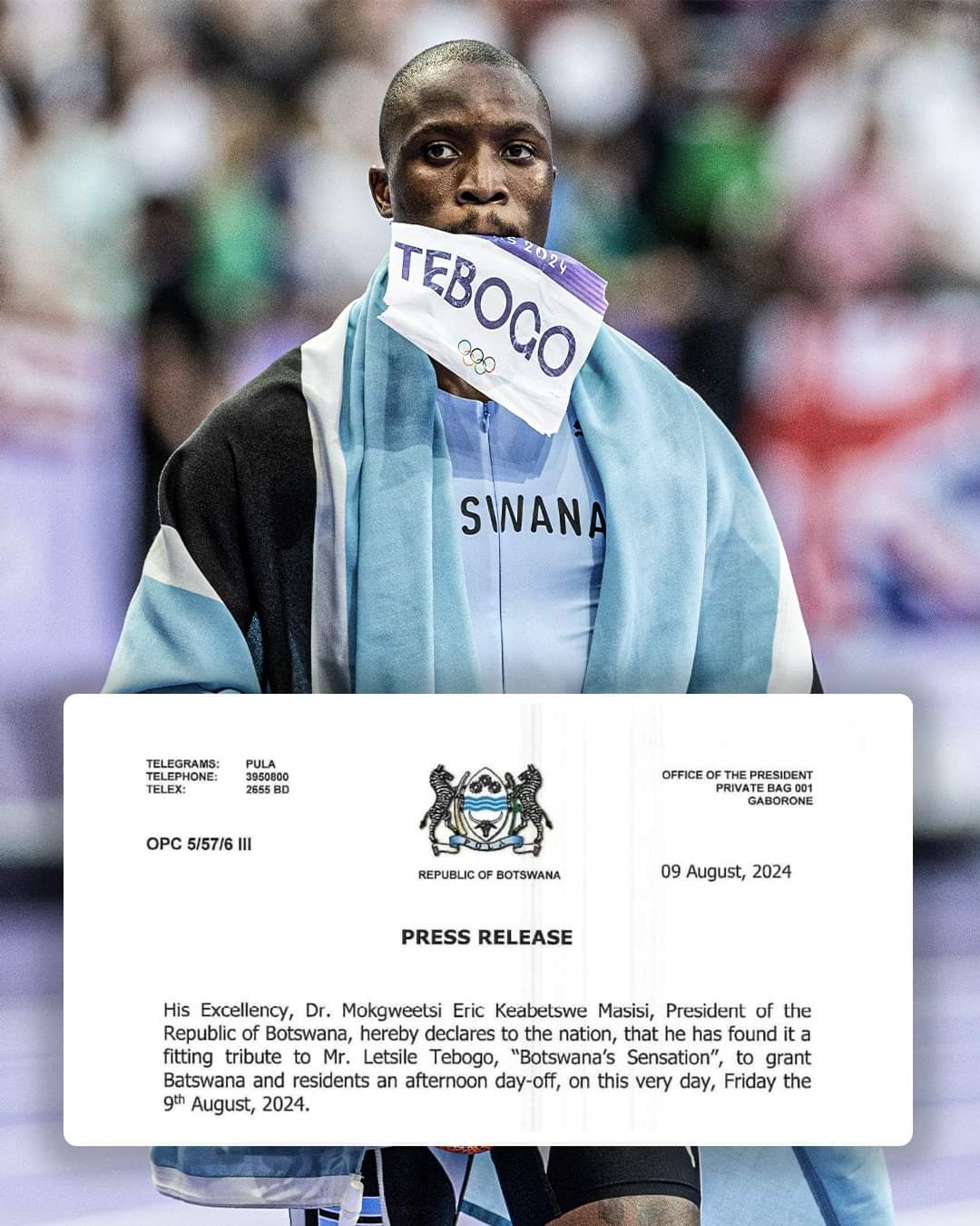 It read, “His Excellency, Dr. Mokgweetsi Eric Keabetswe Masisi, President of the Republic of Botswana, has announced an afternoon day-off for all Batswana and residents today, Friday, August 9, 2024, to honour Letsile Tebogo. Known as ‘Botswana’s Sensation,’ Tebogo made history as the first Motswana and African to win a gold medal in the 200m at the Olympics.