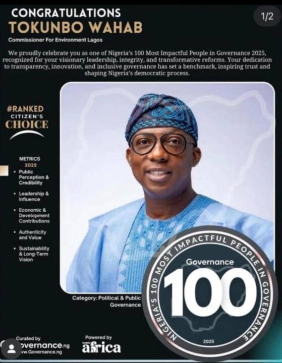 In a testament to his outstanding leadership and dedication to environmental sustainability, Tokunbo Wahab, the Commissioner for Environment and Water Resources in Lagos State, has been named among Nigeria’s 100 most impactful people in governance.