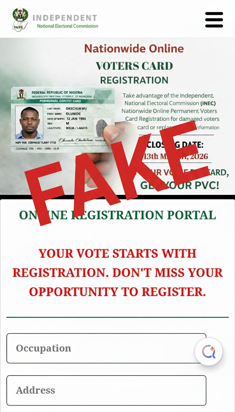 The Independent National Electoral Commission has warned Nigerians about a fraudulent website circulating online that falsely claims to offer nationwide online voter card registration services.